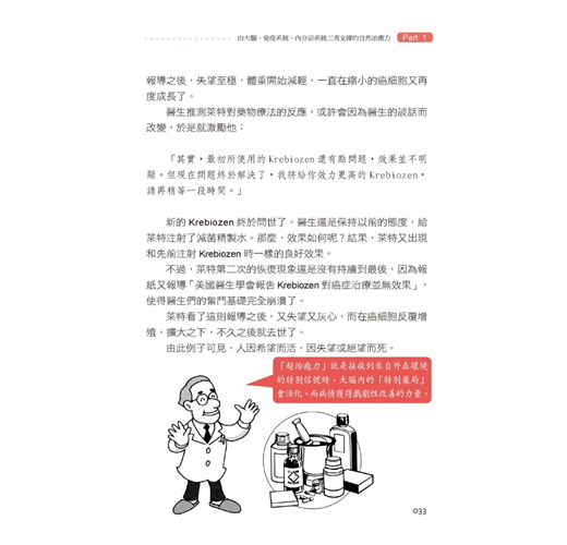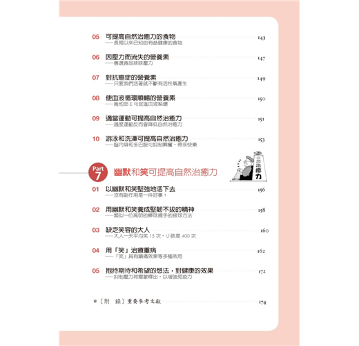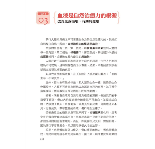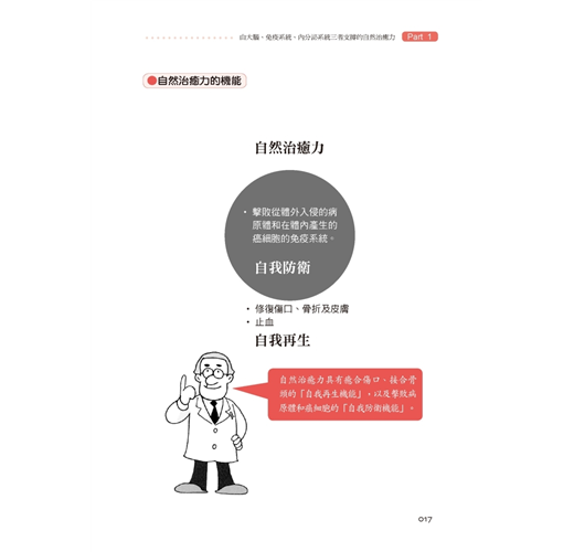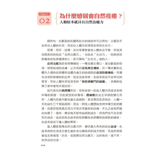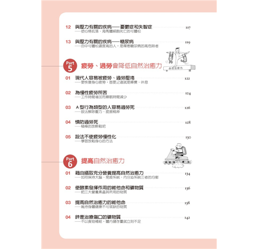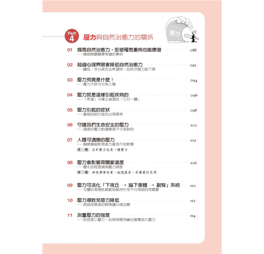 人體具有脫離疾病、恢復健康並抵抗疾病侵襲的自然治癒力,而情緒、壓力及疲勞,則會破壞自然治癒力並引發相關疾病。改變習慣讓大腦、免疫系統、內分泌系統三者保持良好平衡,就能夠發揮強大的自然治癒力,擁有快速回復健康的生命力!