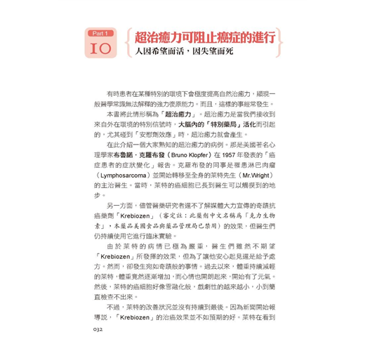 在此介紹一個大家熟知的超治癒力的病例。那是美國著名心理學家布魯諾.克羅布發(Bruno Klopfer)在1957年發表的「癌症患者的症狀變化」報告。克羅布發的同事是罹患淋巴肉瘤(Lymphosarcoma)並開始轉移至全身的萊特先生(Mr.Wright)的主治醫生。當時,萊特的癌細胞已長到醫生可以觸摸到的地步。