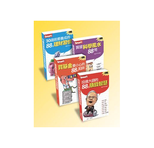 ◎投資大師的88個賺錢智慧----本書介紹9位海外知名投資大師傳頌一時的88個智慧語錄,幫助讀者啟發正確的投資觀念,以求達到個人的財富目標。◎買基金要小心的88個陷阱----本書提出一般投資人購買基金常遇到的問題,弄清楚後,就能避免因不了解而買錯標的,或在不對的時間點、不對的買點進場。◎30歲前要養成的88個理財習慣----本書解析一般人無法在30歲前累積人生第一桶金的原因,建議你養成88個理財習慣,讓你比別人更早退休,或在退休時有更寬裕的經濟能力。◎買屋科學風水88問----本書介紹並剖析一般風水禁忌與原理,提供讀者購屋或居家參考,共分成4個單元,條列並詳細介紹一般人的88個疑惑。