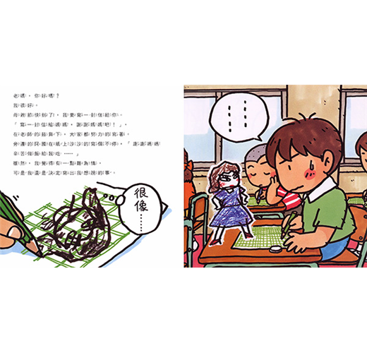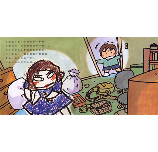 書中她以孩子熟悉的彩色筆,描繪真實的「我」的世界,以兒童畫般凌亂的蠟筆筆觸,來表現男孩記憶中喋喋不休的超現實母親影像,在不同媒材兩相襯托下,使畫面更具張力與幽默感。