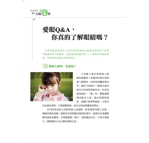你常常眼睛乾澀嗎?你曾有過異物進入眼睛的經驗嗎?你常常眼睛痛嗎?眼鏡好,還是隱形眼鏡好呢?……眼睛不舒服的時候,你真的知道要怎麼處理嗎?