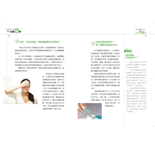 這是一些非常基本、非常實用的知識,在這一本書裡非常系統化的整理在一起,透過美麗的編排、專業又平易近人的文字、彩色清晰正確的畫面,加上獨樹一格「Dr. Yang楊醫師的小叮嚀」方塊,真是造福蒼生。如果我小時候,或是初為人父母時有這麼一本書做為指引,我現在就不必常跟我的小孩討論她的近視矯正、視網膜的問題,甚至只是點眼藥水也大有學問,而我自己也不必為一些眼睛老化的症狀惶惶不可終日。