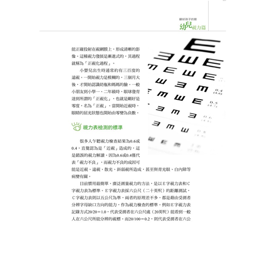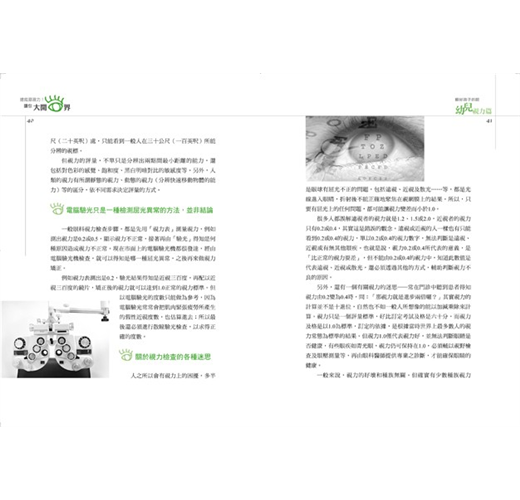 另外,還有一個有關視力的迷思──常在門診中聽到患者得知視力由0.2變為0.4時,問:「那視力就是進步兩倍囉?」其實視力的計算並不是十進位,自然也不如一般人所想像的理所當然以倍計。視力只是一個評量標準,好比訂定考試及格是六十分,而視力及格是以1.0為標準,訂定的依據,是根據當時世界上最多數人的視力常態為標準的結果。