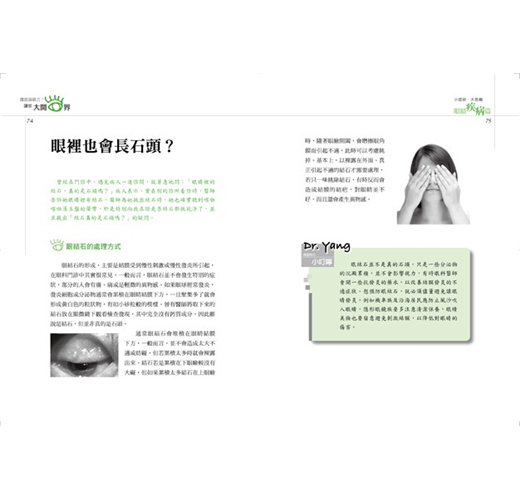 楊長豪副教授這次以簡單扼要的筆法,針對複雜的眼睛完成了對眼睛的基本解剖與生理的介紹,可說相當適宜。在本書中對於我們比較重要的小常識,則以「Dr. Yang楊醫師的小叮嚀」引起讀者的注意與興趣,也是另一特點。