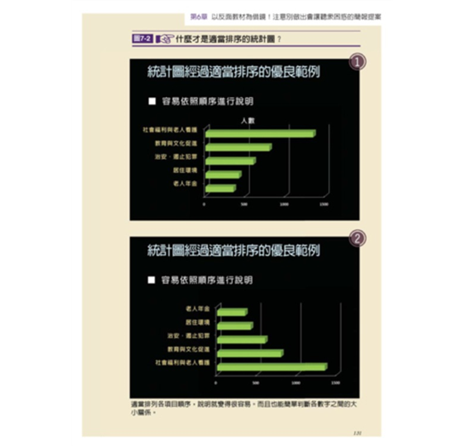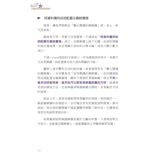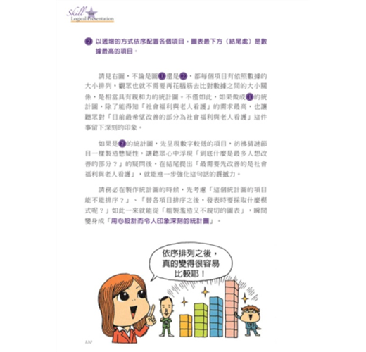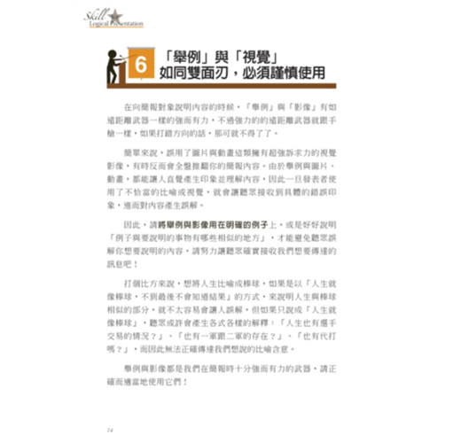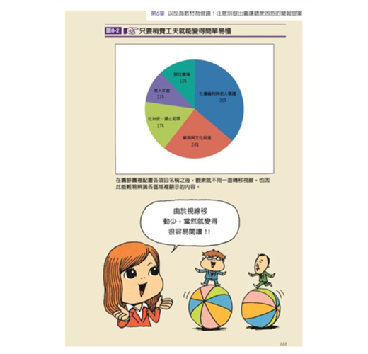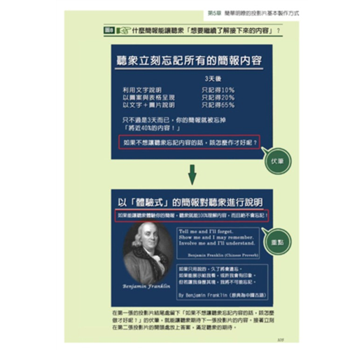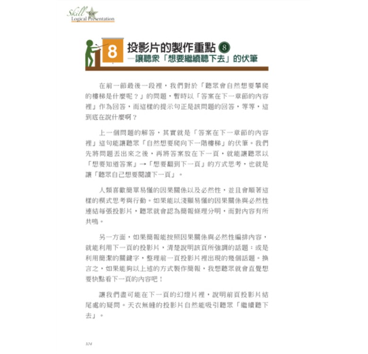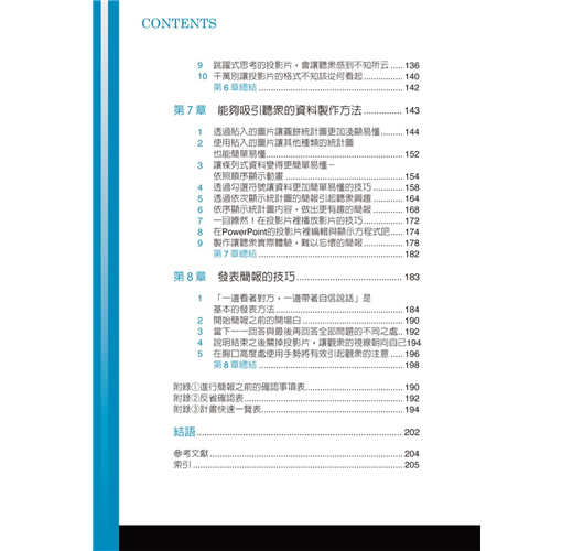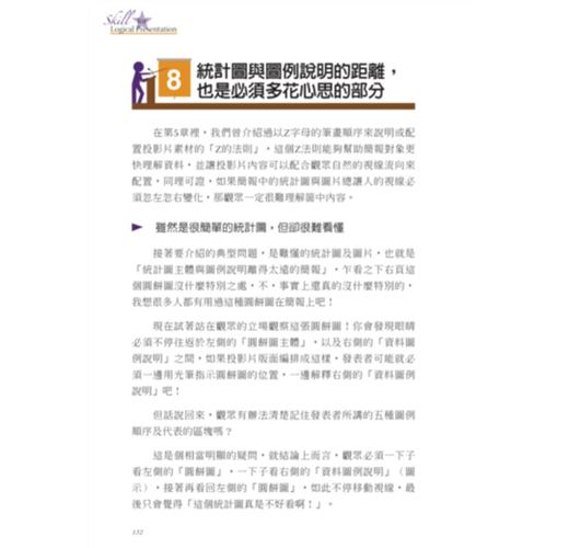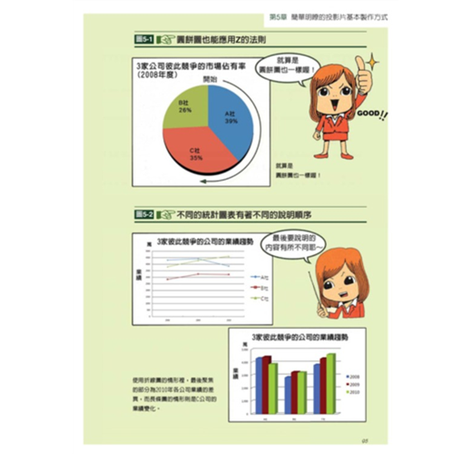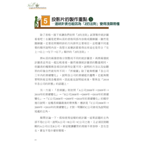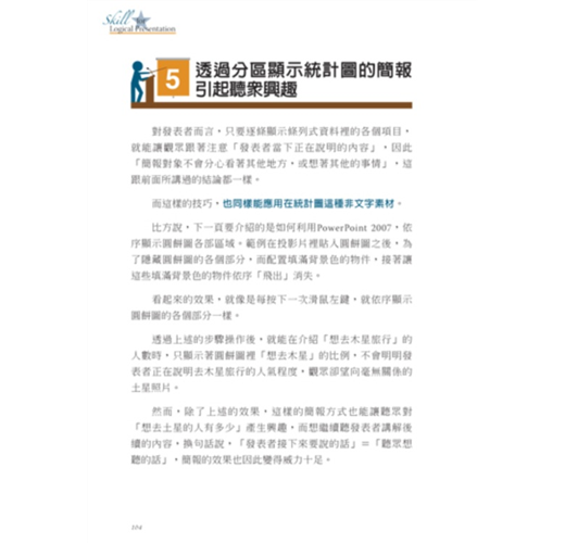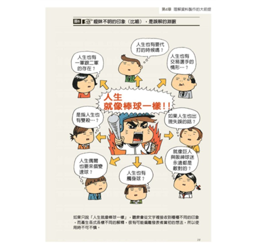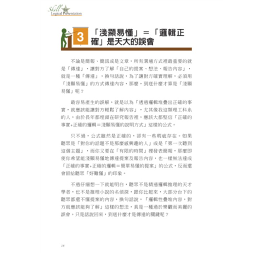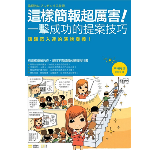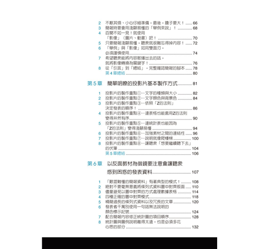 另外,利用有效的簡報方式發表時,如果試著刪去一些簡報資料的話,不可思議的是,居然發現大部分的人(具體來說,100人裡面居然高達90人)會作出「同一典型艱澀難懂的簡報」。因此本書也將介紹如何修改那類「艱澀難懂的內容」。讀了本書,從此你的聽眾不再昏昏欲睡,而是對你的提案內容留下深刻印象!