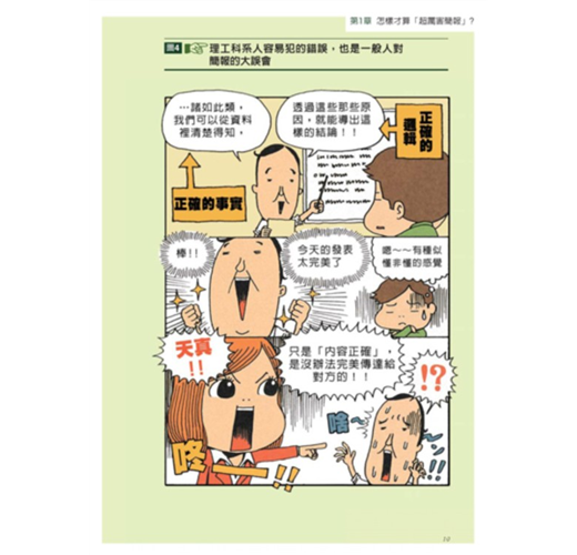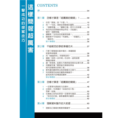 不論是工程人員還是行政人員,簡報發表的時候,真正重要的是如何將自己擁有的材料,以及聽眾想聽的材料完整而巧妙地連結,本書將穿插著簡單易懂的漫畫與插圖加以說明如何讓你與聽眾互相理解的技巧。如果看一下目錄的編排,就應該能夠了解到,一開始的篇幅是站在聽眾的立場,接著是製作概要、內文、關鍵字的方法,這些都是基本而重要的項目,接著當然是介紹如何具體地製作簡單易懂的簡報資料,以及站在台上發表的技巧。