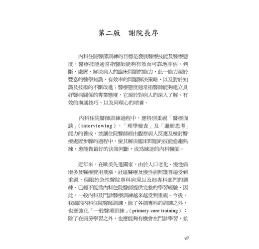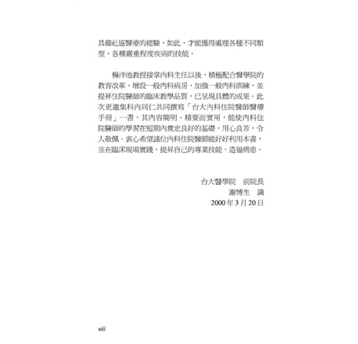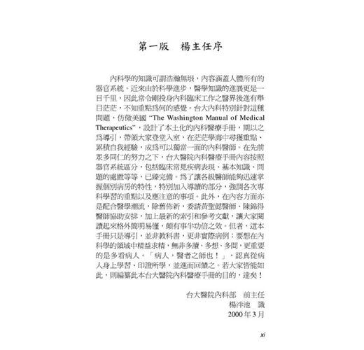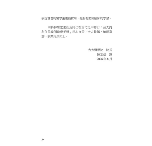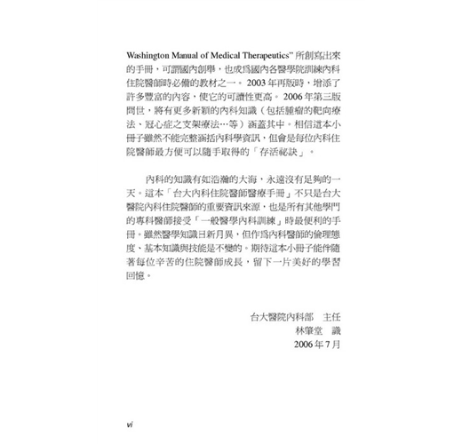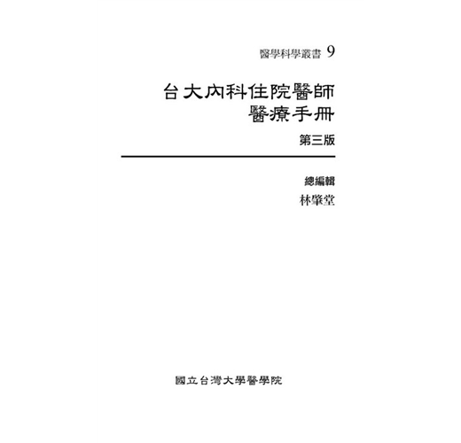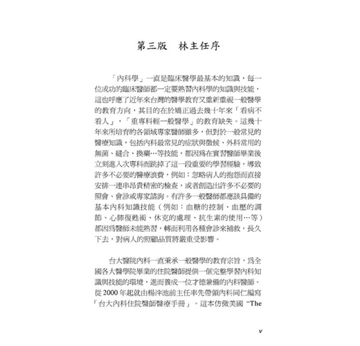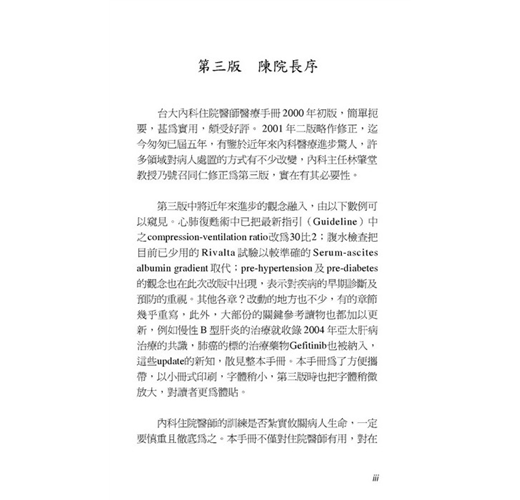 內科學的知識可謂浩瀚無垠,內容涵蓋人體所有的器官系統。近來由於科學進步,醫學知識的進展更是一日千里,因此常令剛投身內科臨床工作之醫界後進有舉目茫茫,不知重點為何的感覺。台大內科特別針對這種問題,仿傚美國 The Washington Manual of Medical Therapeutics,設計了本土化的內科醫療手冊,期以之為導引,帶領大家登堂入室,在茫茫學海中尋獲重點、累積自我經驗,成為可以獨當一面的內科醫師。在先前眾多同仁的努力之下,台大醫院內科醫療手冊內容按照器官系統區分,包括臨床常見疾病表現、基本知識、問題的處置等等,已臻完備。為了讓各級醫師能夠迅速掌握個別病房的特性,特別加入導讀的部分,強調各次專科學習的重點以及應注意的事項。此外,在內容方面亦是配合醫學潮流,除舊佈新,委請黃聖懿醫師、陳錦得醫師協助安排,加上最新的索引和參考文獻,讓大家閱讀起來格外簡明易懂,頗有事半功倍之效。但者,這本手冊只是導引,並非教科書,更非實際病例;要想在內科學的領域中精益求精,無非多讀、多想、多問,更重要的是多看病人。「病人,醫者之師也!」,認真從病人身上學習、印證所學,並進而回饋之。