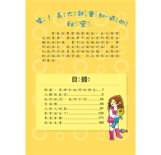 「超簡單!健康教育養成的第一暢銷書」與你(妳)分享青春期的點點滴滴,了解性器官的自我認識我們都曾經歷過相似卻又不同的青春期,從第一顆痘痘冒出、身體像巨人一般逐漸變大,你(妳)知道我們的身體變化了什麼嗎?那一定不是傑克的魔豆,也不是巫婆的魔法,但那是什麼呢?青春期的問題讓我們害羞難以啟齒,學會了解卻是一件很重要的事。打開書中,告訴你(妳)一切關於青春期的發展、性器官的解答、尊重他人身體和保護身體不受別人傷害。
