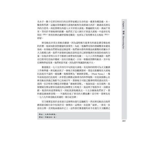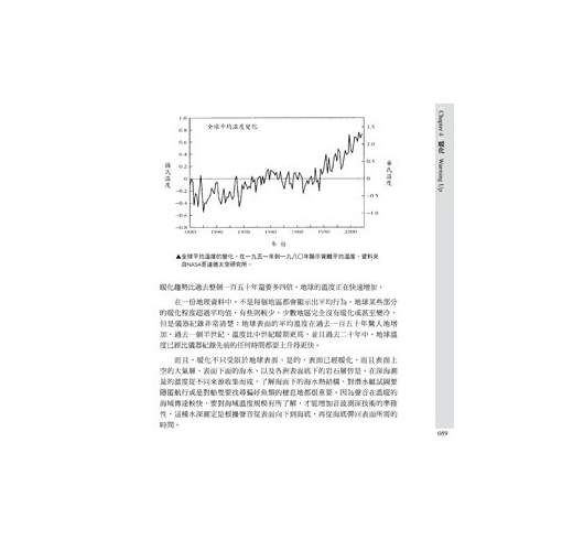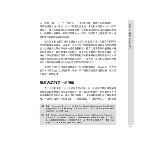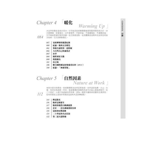 本書除將歷史情節置入,也詳述近代人們旅遊南北極的熱衷,更探討冰的多重角色,與追尋上次冰期遺留下的痕跡,及中世紀暖期、小冰期等訊息。世界各個角落,都是本書筆觸可以抵達之處。至於科學面,除地球表層的演變,也介紹氣溫觀測發展史,當然海溫觀測是較困難的課題。閱讀此書,必須深深思索:現今的一切是源自古人的努力,同樣地,現今的發展將會影響下一代人類。