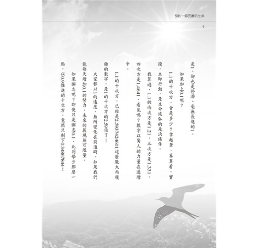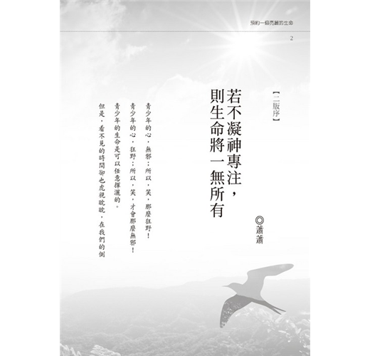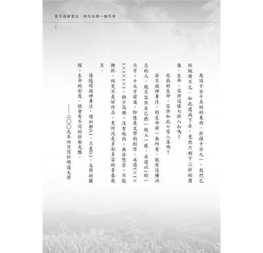 若不凝神專注,則生命將一無所有。能有這種決志的人,絕不容許自己跟一般人一樣,永遠以1的一次方、十次方前進,即使是文學的創作,永遠1×1×1×1×1×1,缺少高潮、沒有起伏、無法懸宕、不能轉折,終究不是好作品,更何況是多彩多姿的青春歲月。