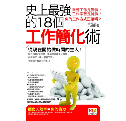別再煩惱了!《史上最強的18個工作簡化術》即是一本導正你的工作方式,幫助你「妥善運用時間」、「簡化工作中不必要的流程」。只要搞懂這18個工作簡化術,包你每天工作不再苦哈哈,卡鐘一響就下班!