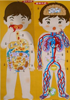 全書展開後,高度大約是一個2~3歲小小孩,前後有「我的身體」、「我的骨骼」、「消化系統」、「循環系統」四幅圖,可以讓小小孩認識自己身體的各部位,包括五官、肢體(手、腳)、五臟六腑、骨頭。