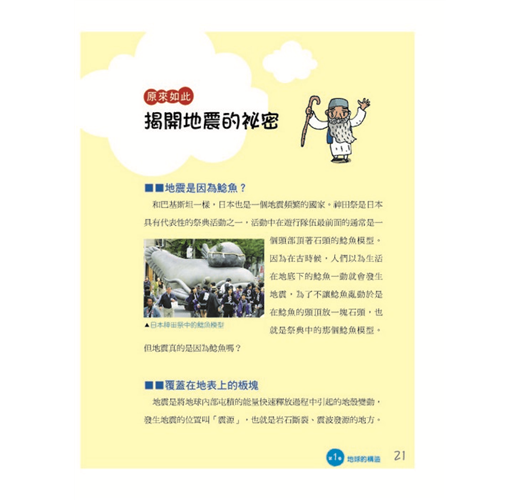 本書秉持著這樣的核心概念,透過【生活中的科學謎題】及【原來如此】講解。例如,說明地震產生的原因時,一同介紹「大陸漂移說」及「板塊構造說」;透過介紹米開朗基羅的《聖母慟子像》,解釋大理石這種岩石以及「岩石的形成與特性」;或是,證明孫悟空的筋斗雲實際上並不存在,同時解釋「雲的形成」;透過南半球的人們在海邊過聖誕節來說明「地球公轉」。