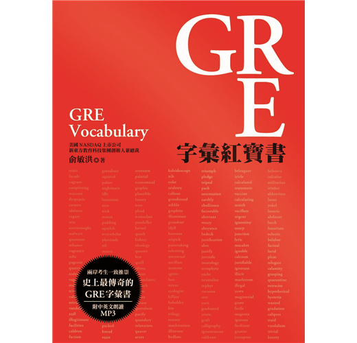 GRE字彙難背是出了名的,對考生來說,背GRE單字幾乎是出國留學前最大的夢魘。為了熟背數以萬計艱澀的字彙,考生無不使出渾身解數,運用各種能加強記憶的背誦法,只求在考試前能將字彙記牢。本書是北京新東方科技教育集團創辦人俞敏洪,集畢生的教學經驗,傾囊相授之作,廣受中國大陸考生的愛戴與推崇,十幾年來已幫助數十萬名考生取得高分,順利出國留學。自1993年初版以來,封面的設計一直沿用紅色色調,因此被廣大的GRE考生通稱為「紅寶書」。