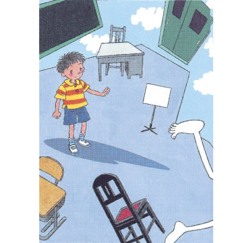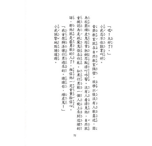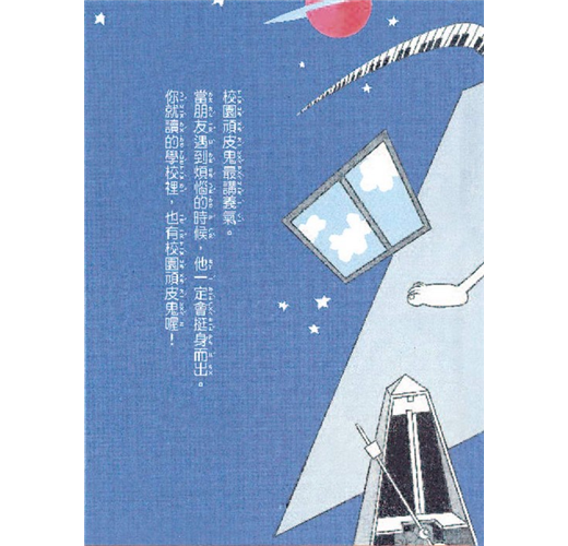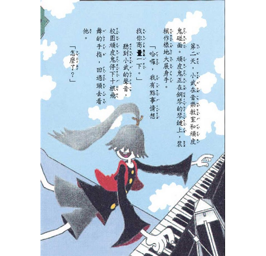 音樂教室就在自然教室隔壁,放學以後沒有人敢靠近,因為校園頑皮鬼經常把鋼琴敲得叮咚響。沒有人看得見他,自然就會被認為是妖魔鬼怪在作亂。如果行男敢一個人晚上來到這裡的話,那他就是最勇敢的人了,相信他一定會重拾信心。