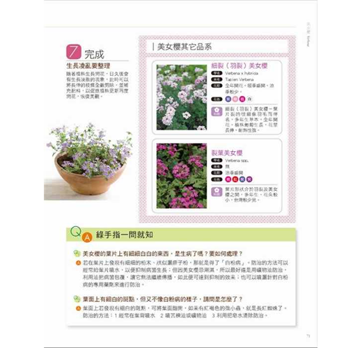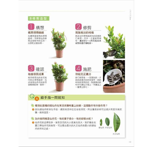 不知道如何換盆嗎?不知道如何修剪?我要一盆變成二盆大繁殖?針對每種植物最常出現的栽種問題如怎麼換盆?長大了要如何修剪?如何扦插繁殖?何時該施肥?等提出最正確的解決方法,並且有精美的圖解步驟step by step,讓人一目了然,非常適合新手入門。
