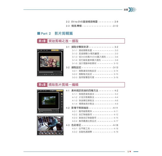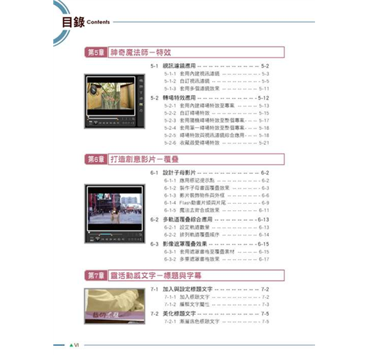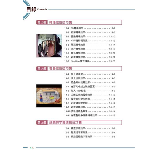 架構於第二篇的基礎上,按技巧、特效與輸出格式分類,如:擷取與編輯、濾鏡特效、轉場特效、覆疊、標題與字幕、音訊處理、影片輸出等。讀者可依個人需求快速查找並迅速應用大量的進階技巧與特效。