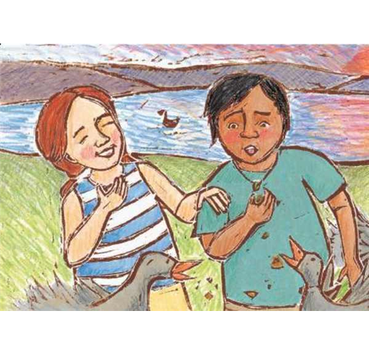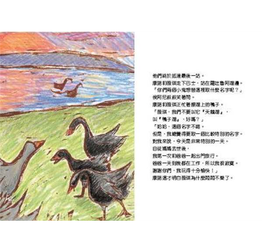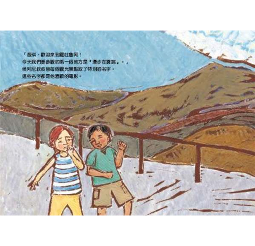 整本書的插畫以輕快、溫暖的淡粉大地色調和樸拙的版畫線條呈現,在在洋溢著旅行的歡暢氣息。毛利男孩康諾與英國女孩薇琪之間的友誼,象徵在地人對外來旅人的歡迎和熱情,也點出了從事觀光業應有的服務熱忱和愛鄉情懷。相關主題:紐西蘭 ─ 觀光業英國女孩薇琪跟著爸爸前來紐西蘭的羅吐魯阿參加會議,父女倆沒有安排任何觀光活動。這個女孩直嚷無聊,心情簡直糟透了,恨不得快點回家。