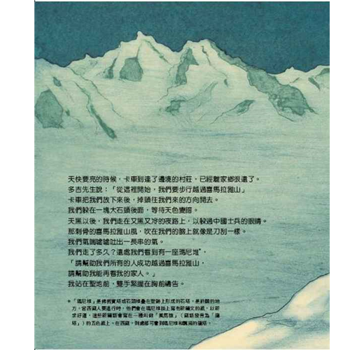 珍惜這份得來不易的自由及學習機會。相關主題:西藏 ─ 未來教育透過《越過喜馬拉雅山》這個故事,讓我們了解到自由的可貴。書中的小朋友明瑪希望受西藏教育和遵循原有宗教不殺生的精神,卻被迫退學,失去了受教育的權利,也面對被老師同學排斥傷害的命運。他的父母親在不得已的情況下,只好讓這個年幼的小孩跟隨其他藏人,攀越世界屋脊喜馬拉雅山去尋找可以自由生活和受教育的地方。
