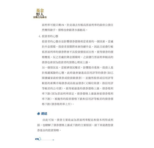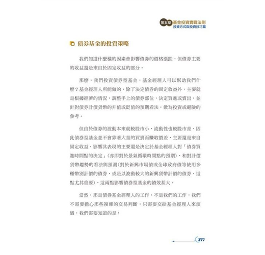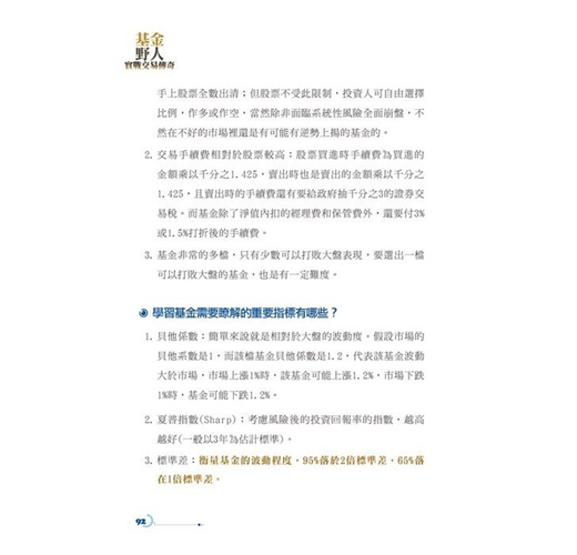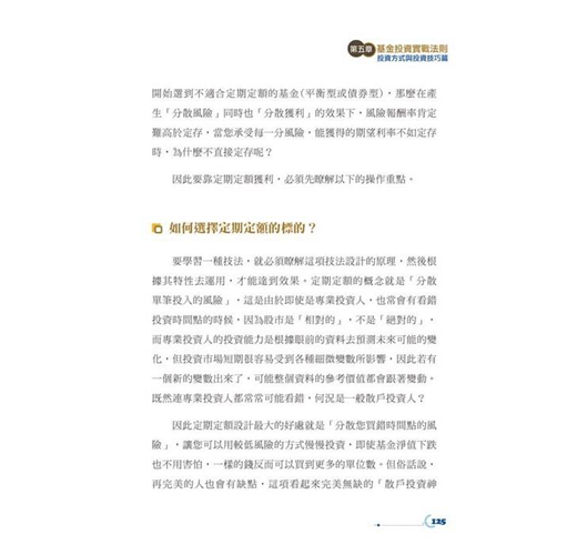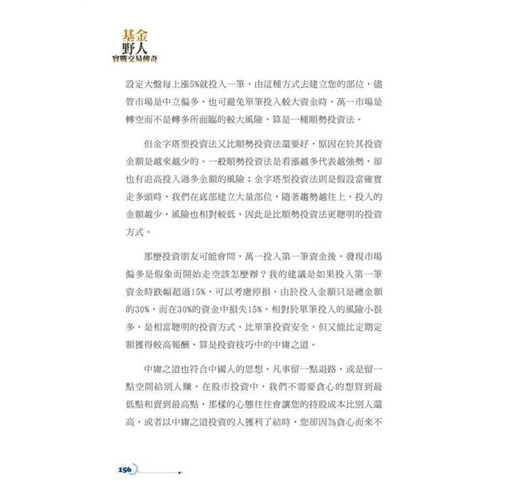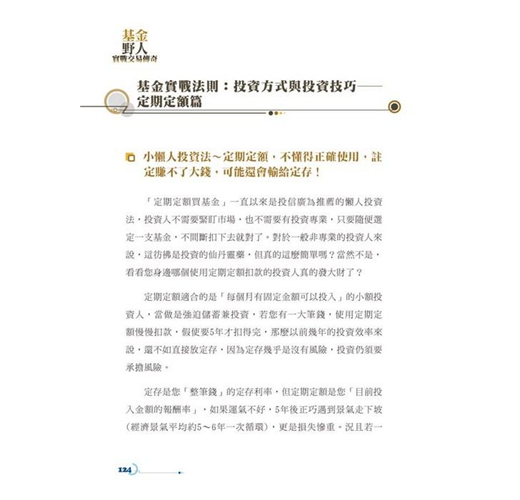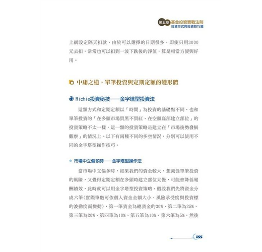 此外,陳先生對於投資方式與投資技巧也相當講究,不但完整分析了單筆投資與定期定額的優缺點,並且還更上一層樓,針對定期不定額、不定期定額與金字塔型投資法等新種基金投資技術,進行更詳盡的闡述,讓投資人能夠真正做到「知行合一」。