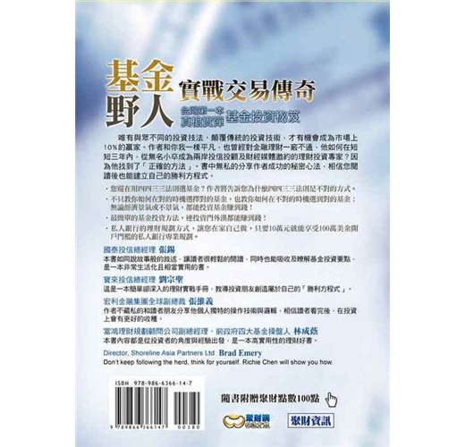 這本書還有更多Richie的實戰經驗和擔任理專的心得,例如不同匯率的基金該如何投資、債券基金的優劣等,都是從投資者的角度與經驗出發,對於在基金叢林中闖蕩的新手有很大的幫助;資深的朋友可以將自己的心得和本書印證,相信功力會更上層樓。這是一本高實用性的理財好書,值得向您推薦。