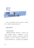 □妳的男友是父系社會的大男人嗎?如果妳的男友是上述的五種男生之一,請妳要勇敢地離開他,在客觀條件上,這五種男生都是壞男人,也許分手會讓妳心痛不已,但還是希望妳能勇敢放手。如果妳依舊不以為然的話,請妳把這本書看完。