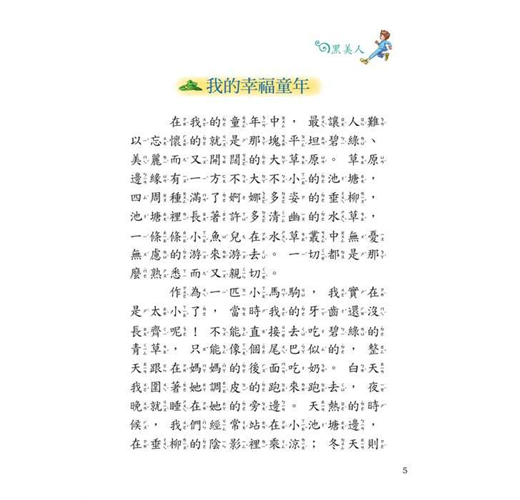 童年時的我是快樂的,媽媽對我說要溫文爾雅,做一匹主人賞識的駿馬;主人愛憐的撫摸著我的腦袋,親切的叫我「黑美人」。可是,從戴上馬嚼子的那一天起,我就告別了自由的生活,開始了苦不堪言的歷程。【書籍特色】1.彩色注音版2.提升國語文能力,訓練閱讀、寫作技巧3.九年一貫國語科、作文基測最佳輔助教材 藉由各地不同的世界經典故事,教化孩子對於知識的廣闊性,使用不同的寫作技巧與故事情節,孩子們可從中學習到各種激勵人心、感化教人的動容故事。從小讓孩子接觸富有意義的童話世界,培養優良品德教育的基石。