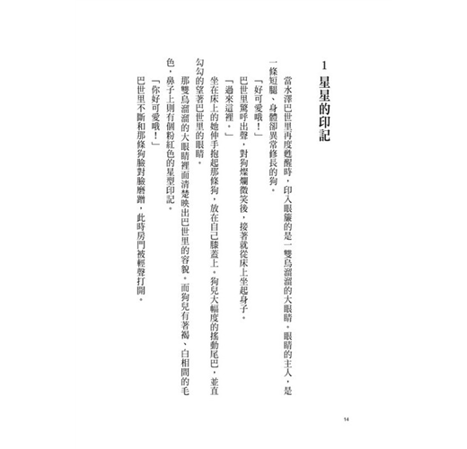 那雙烏溜溜的大眼睛裡面清楚映出巴世里的容貌。而狗兒有著褐、白相間的毛色,鼻子上則有個粉紅色的星型印記。