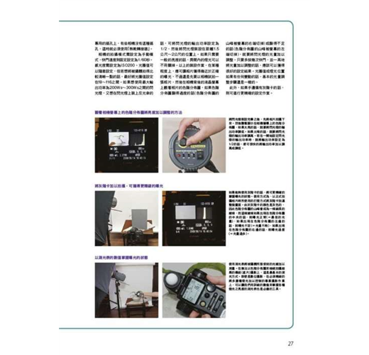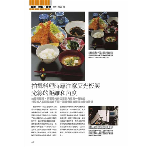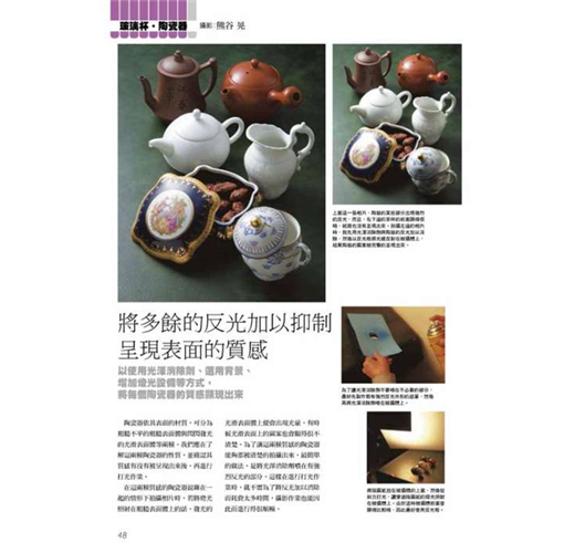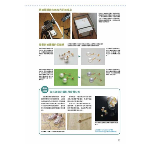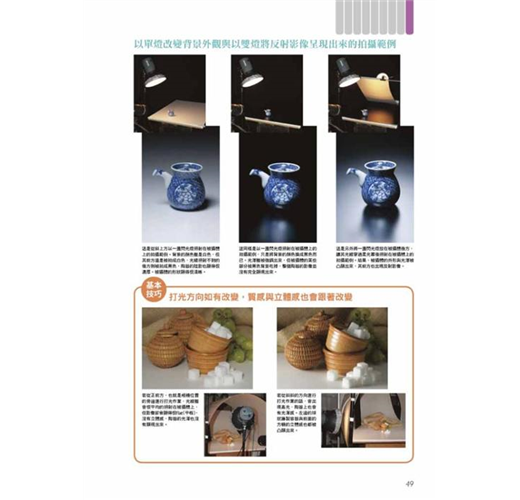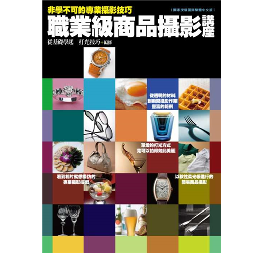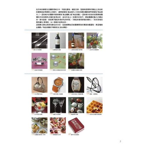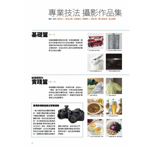 攝影師在打光方面擁有專業技巧,能夠自由操控光源猶如施展光與影的魔術,不只是重現被拍攝體的形狀、色彩與質感,還能將物體本身具有的魅力展現於外,像商品廣告這類在攝影棚內的靜物攝影更是與打光技術密不可分,包括照明、腳架、反光板等攝影器材與物品擺放的位置、角度都有著深奧學問,透過不 同的表現手法拍出能符合或強調商品質感的風格。 目錄 2 專業技法攝影作品集 攝影‧解說:玉內公一/長谷川 修/古浦敏行/新藤修一/ 熊谷 晃/關川真佐夫/上俊彥 4 基本篇 讓我們試著進行桌上攝影作業吧/從正