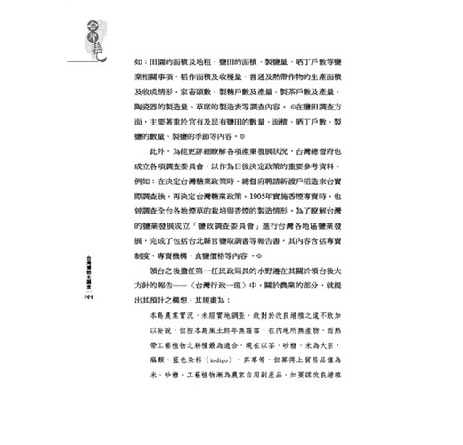 領台之後擔任第一任民政局長的水野遵在其關於領台後大方針的報告——〈台灣行政一斑〉中,關於農業的部分,就提出其預計之構想,其規畫為: