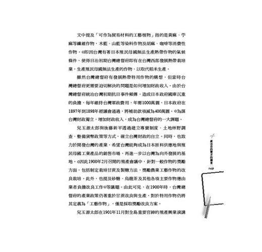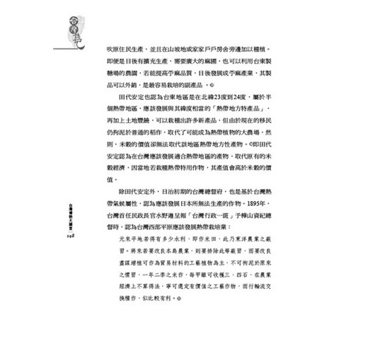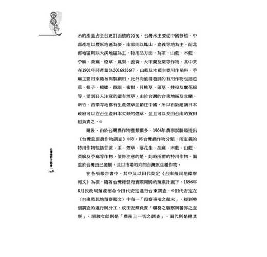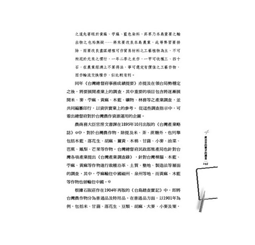 本島農業實況,未經實地調查,故對於改良增殖之道不敢加以妄說,但按本島風土終年無霜雪,在內地所無產物,而熱帶工藝植物之耕種最為適合,現在以茶、砂糖、米為大宗,麻類、藍色染料(indigo)、菸草等,但算得上貿易品僅為米、砂糖。工藝植物漸為農家自用副產品,如要謀改良增殖之道先著眼於黃麻、苧麻、藍色染料,菸草乃本島重要之輸出物之也殆無疑……將來要改良本島農業,此等弊習要排除,而要改良盡謀增殖可作貿易材料之工藝植物為主,不可拘泥於元來之慣行,一年二季之米作,一甲可收穫三、四十石,在農業經濟上不算得法,寧可選定有價值之工藝作物,而作輪流交換種作,似比較有利。
