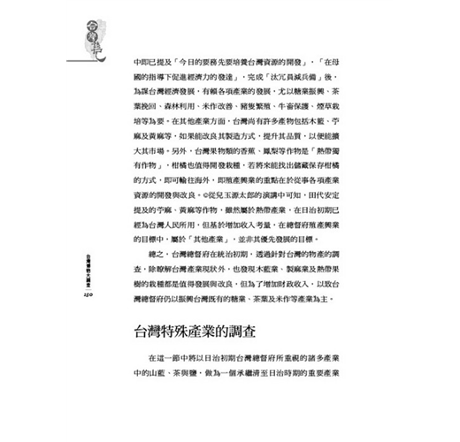 同年《台灣總督府事務成績提要》亦提及在領台局勢穩定之後,將要展開產業上的調查,其中重要的項目包含將逐漸展開米、麥、苧麻、黃麻、木藍、礦物、林務等之產業調查,並共同編纂印行,以資供實業上的參考。 從這些調查指示中,可看出總督府對於台灣農作資源運用的企圖。
