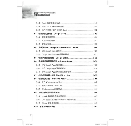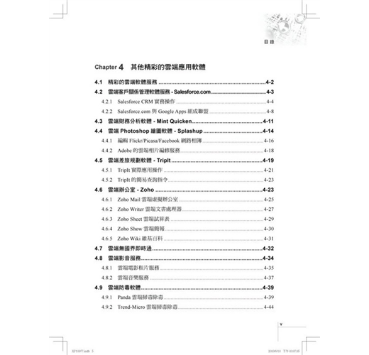 本章嘗試將目前個人電腦上常用的軟體操作,全部改成在雲端上操作,例如:當你需要閱讀電子郵件時,就開啟Gmail服務,不再需要客戶端的電子郵件軟體Outlook或Exchange,然後透過Gmail傳送由雲端辦公室軟體Google Docs所編輯的Word檔案與PowerPoint投影片給同事,並將大量的SpreadSheet試算表分析資料放在Google Base雲端資料庫,不再需要安裝資料庫軟體MySQ...