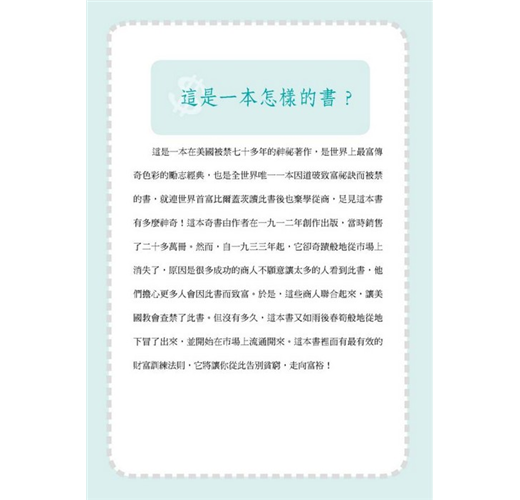 「秘密」背後的「大秘密」!改改變一生命運的奇書!它讓世界首富比爾蓋茨棄學從商,讓拿破崙‧希爾成為成功大師,由於揭露天大的致富秘密,被商人聯合禁賣了72年!它能讓每個實踐的人,遠離貧窮,走向富裕。這是一本在美國被禁七十多年的神祕著作,是世界上最富傳奇色彩的勵志經典,也是全世界唯一一本因道破致富祕訣而被禁的書,就連世界首富比爾蓋茨讀此書後也棄學從商,足見這本書有多麼神奇!這本奇書由作者在一九一二年創作出版,當時銷售了二十多萬冊。然而,自一九三三年起,它卻奇蹟般地從市場上消失了,原因是很多成功的商人不願意讓太多的人看到此書,他們擔心更多人會因此書而致富。於是,這些商人聯合起來,讓美國教會查禁了此書。但沒有多久,這本書又如雨後春筍般地從地下冒了出來,並開始在市場上流通開來。這本書裡面有最有效的財富訓練法則,它將讓你從此告別貧窮,走向富裕!