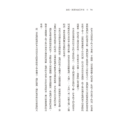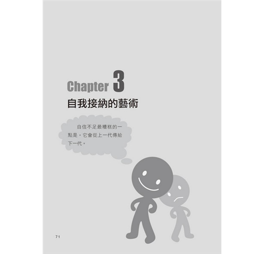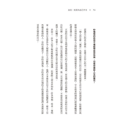 而這本書就是把「自信」從掙扎寫到創造,從平凡寫到偉大,從物質寫到心靈的暢銷佳作。作者從掙脫思想與習慣束縛,勇敢的改變(第一~五章)談起,繼而發揮心靈本質力量點亮自己(第六~十章),最後再回歸到日常生活的實踐與修練(第十一~十四章)。