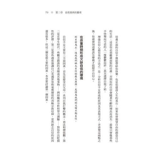 這本書用最直白的語言把生活中種種病態的不自信透過大量舉例說明並給與了正確的治療方法。不得不佩服作者對人類心理的剖析,我在書上也看到了自己的影子和一直不敢面對的自己。雖然徹底改變還要花很大的勇氣和毅力,但會成功的。