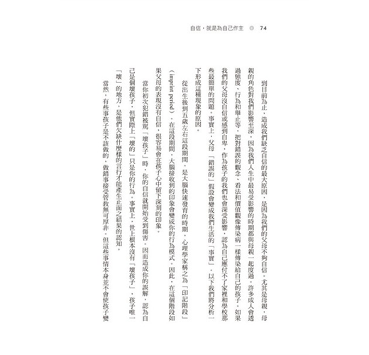從出生後到五歲左右這段期間,是大腦快速發育的時期,心理學家稱之為「印記階段」(imprint period)。在這段期間,大腦接收到的印象會變成你的行為模式。因此,在這個階段如果父母的表現沒有自信,很容易會在孩子心中留下深刻的印象。