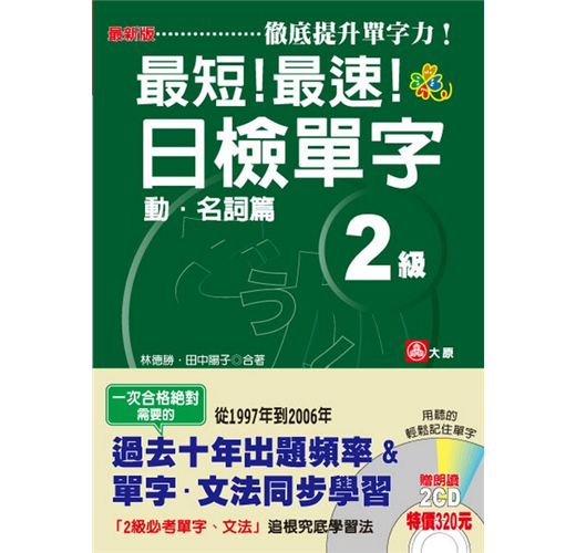 最新版《最短!最速!日檢單字2級(動‧名詞篇)》是全國首創單字跟文法一起學習的考試最佳幫手。書中精心編寫一個句子裡有2級單字,還有2級文法,而且每個句子的內容更是包羅萬象。不僅如此,還附上兩片CD,讓您考試如虎添翼,因為您可以一聽再聽又再聽,這樣就可以一次把2級的單字、文法,甚至閱讀、聽力完全掌握了!