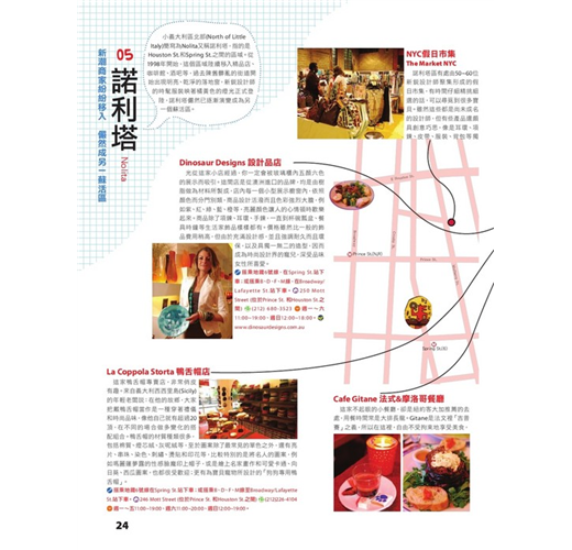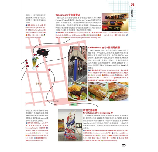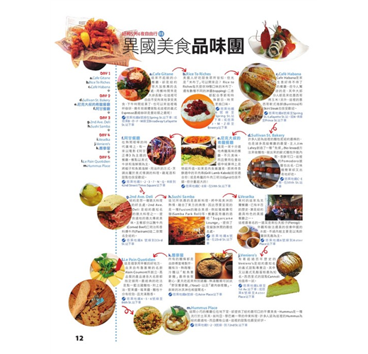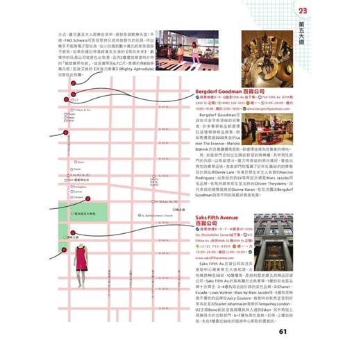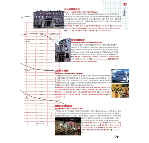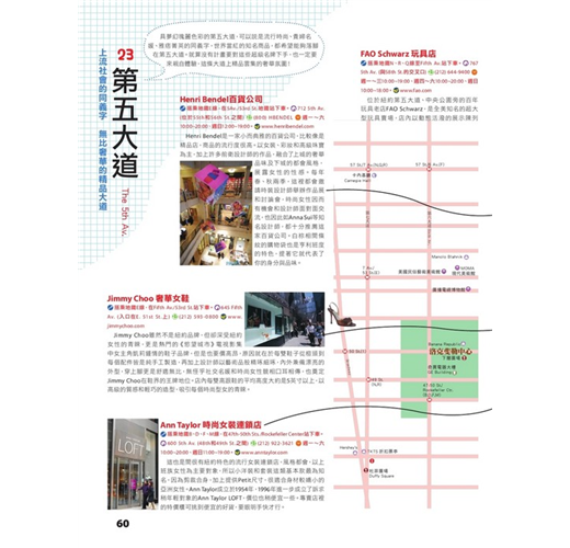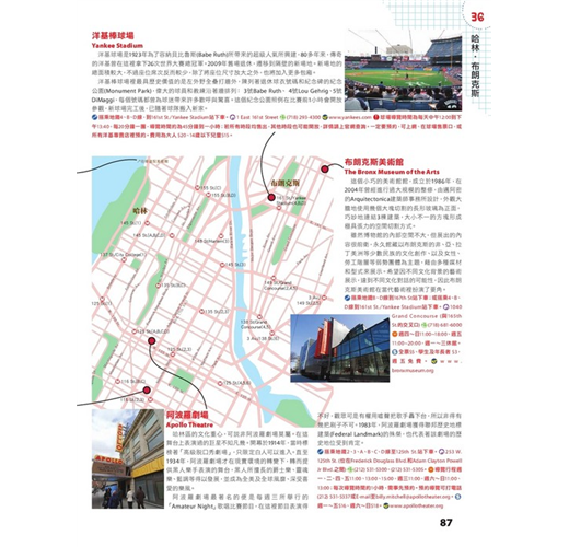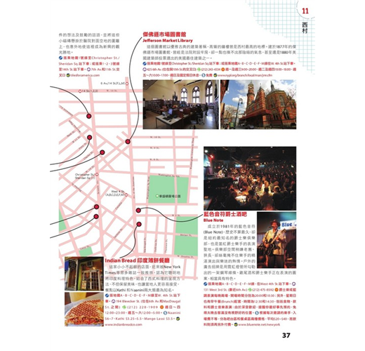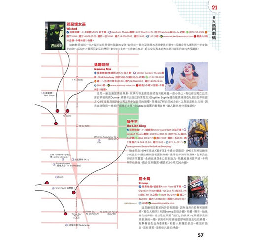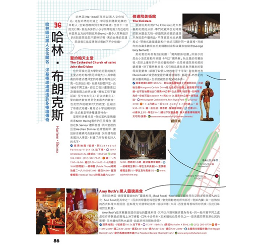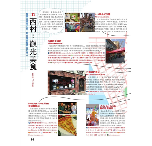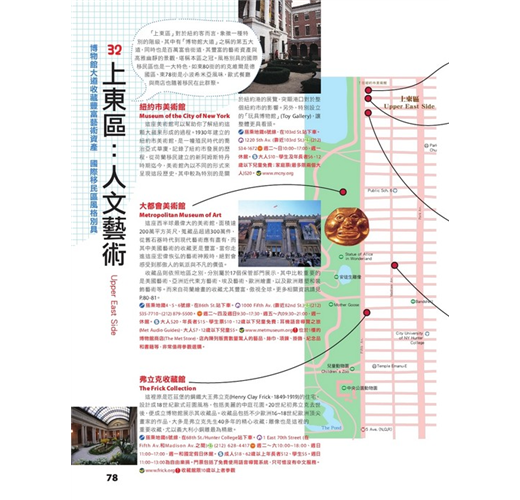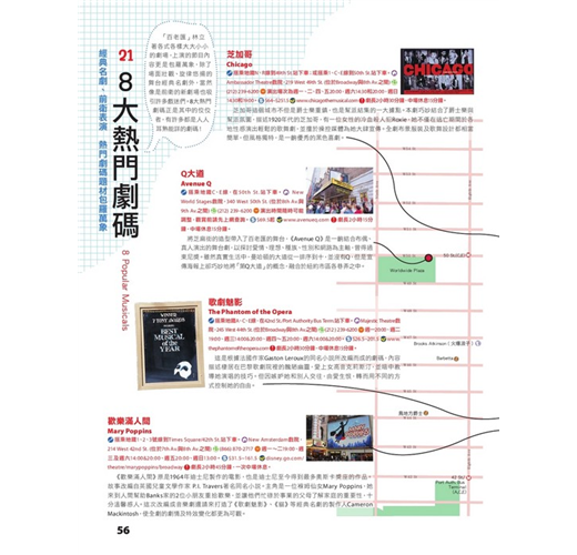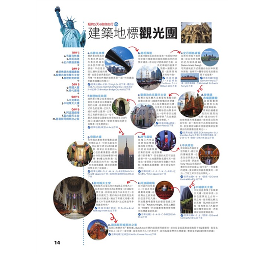 本書除了提供6大自由行建議、紐約慶典活動、紐約基本情報等資訊之外,在內文方面,共將紐約分成38個區域,每個區域均有獨立的分區地圖,其上仔細標示出區域內重要的觀光景點,以及吃喝玩樂好去處。每個介紹的據點不但有旅遊重點提示,更有完整的地鐵或公車等交通資訊,讓讀者能夠從中挑選出想要造訪的地點,並輕鬆安排行程與交通。