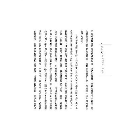作為引領大家認識白魔法的新時代女巫,只能說請原諒「一點也不神祕甚至有點搞笑」的她吧,誰說女巫一定要剪蟾蜍尾巴熬藥、或在黑暗中詛咒他人?同樣是神祕學的愛好者,我很清楚YoYo想傳遞的是「正面思維的強大力量」,這也正是我們都堅持的信念。猶記我也是建議YoYo把學習魔法的神奇經歷寫成小說的人之一,沒想到今年竟真的完成了…。收到稿子後的感覺是,就算僅當成小說閱讀也非常引人入勝,且更能體會她透過不同方式介紹魔法給大家認識的苦心。