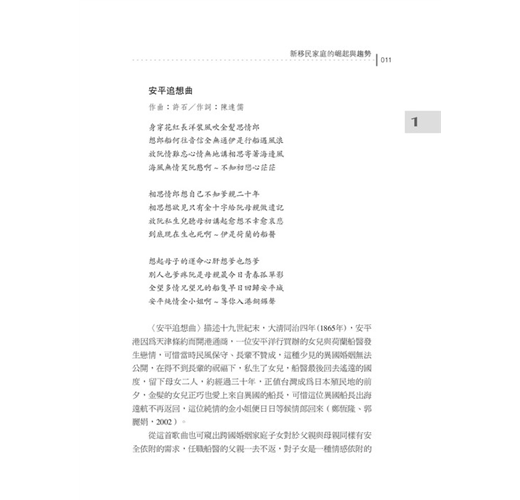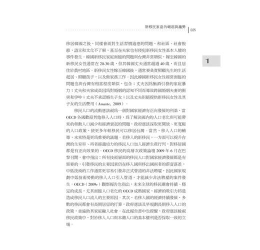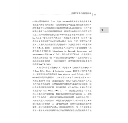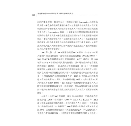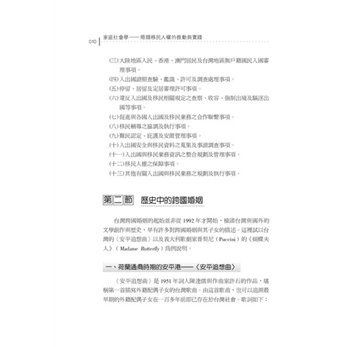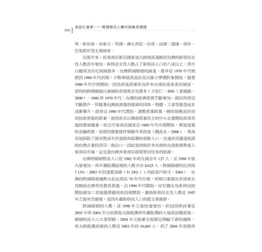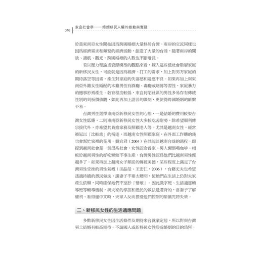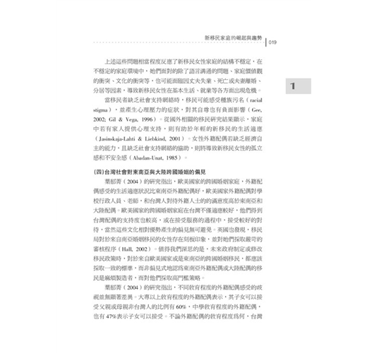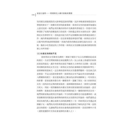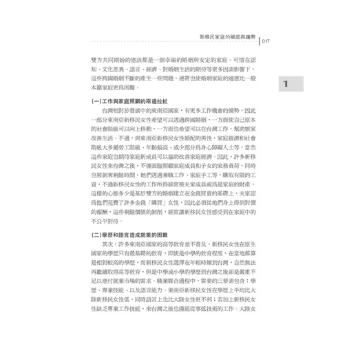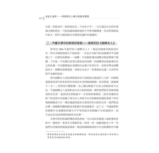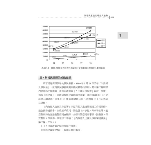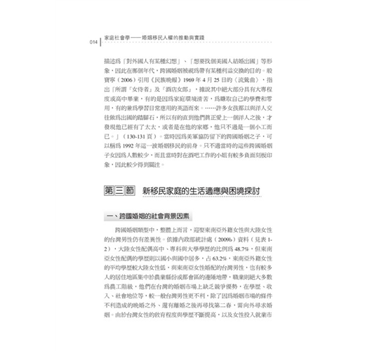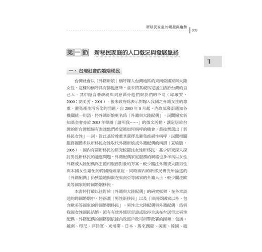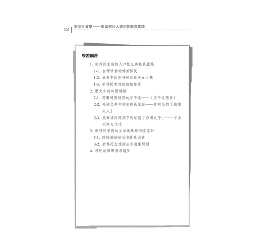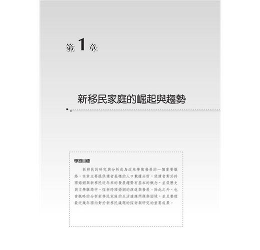 全書內容佈局由廣而精,先從大範圍的概述,讓讀者對新移民的議題能有通盤的認識,了解新移民家庭的現象在台灣社會中的重要性;其次探討新移民家庭與社會的互動、連結;最後再提出不同新移民家庭的樣貌,以供讀者進行思考與討論新移民人權的意義。
