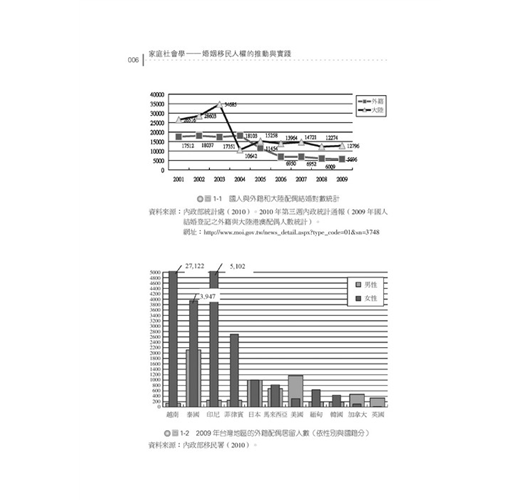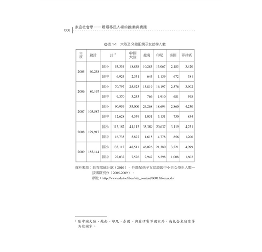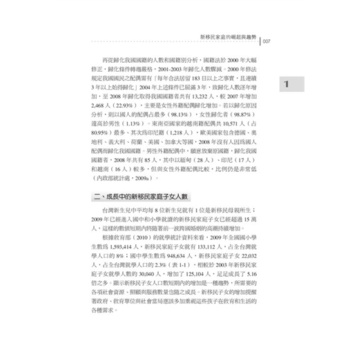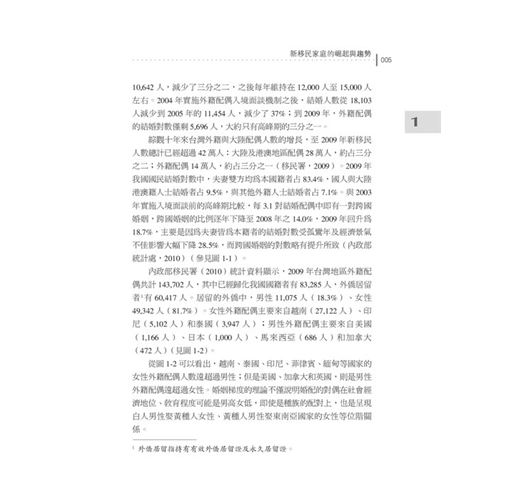 本書除提供教科書所擁有的基本理論與知識,同時也提供個案範例作為實質的討論,讓讀者反思新移民人權的議題,並鼓勵使用本教材的老師可以在課堂上帶領學生討論個案。同時也希望藉由本書的導引,倡議新移民家庭在婚姻關係、家庭適應、子女教育、性別角色、工作職涯等基本人權的議題與實踐。這是本書期望達成的目標。