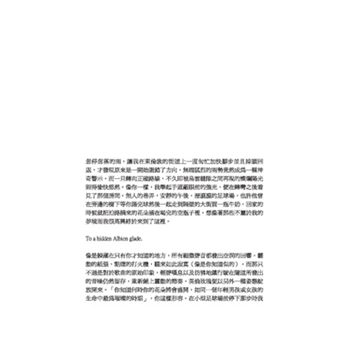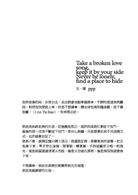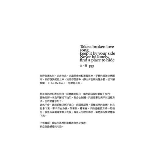 「永遠會是什麼模樣呢?仍然不知道。這些年經歷了太多意想不到的變化之後,早已不再臆測未來,學不會的教訓依舊令我絆倒與頹喪。然而當所有人一起熱烈起來我們便只在意當下而無懼其他,去他的永遠,我們都這樣被催眠。我們都這樣相信,並且實踐。這樣就夠了,我趴在欄杆上,輕輕地笑起來。」--ppp, Take a broken love song, keep it by your side. Never be lonely, find a place to hide