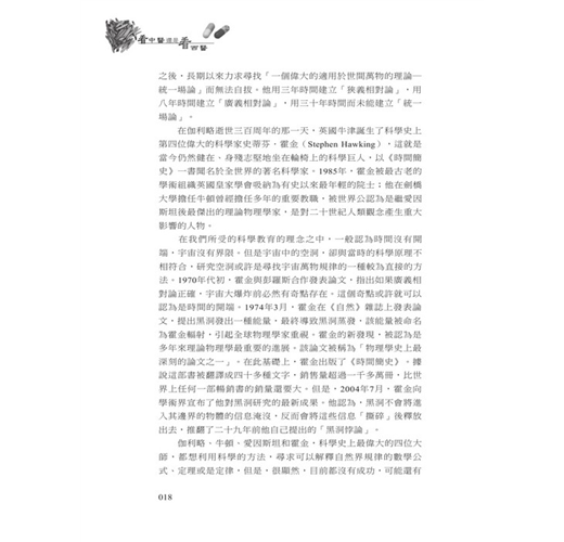 在我們所受的科學教育的理念之中,一般認為時間沒有開端,宇宙沒有界限。但是宇宙中的空洞,卻與當時的科學原理不相符合,研究空洞或許是尋找宇宙萬物規律的一種較為直接的方法。1970年代初,霍金與彭羅斯合作發表論文,指出如果廣義相對論正確,宇宙大爆炸前必然有奇點存在。這個奇點或許就可以認為是時間的開端。1974年3月,霍金在《自然》雜誌上發表論文,提出黑洞發出一種能量,最終導致黑洞蒸發,該能量被命名為霍金輻射,引起全球物理學家重視。霍金的新發現,被認為是多年來理論物理學最重要的進展。該論文被稱為「物理學史上最深刻的論文之一」。在此基礎上,霍金出版了《時間簡史》。據說這部書被翻譯成四十多種文字,銷售量超過一千多萬冊,比世界上任何一部暢銷書的銷量還要大。但是,2004年7月,霍金向學術界宣布了他對黑洞研究的最新成果。他認為,黑洞不會將進入其邊界的物體的信息淹沒,反而會將這些信息「撕碎」後釋放出去,推翻了二十九年前他自己提出的「黑洞悖論」。