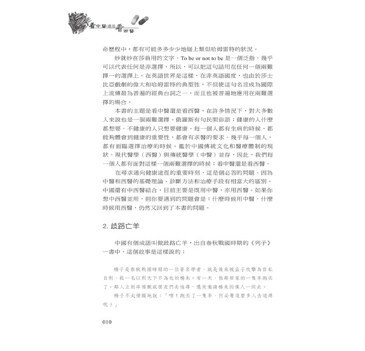 本書的主題是看中醫還是看西醫,在許多情況下,對大多數人來說也是一個兩難選擇。俄羅斯有句民間俗語:健康的人什麼都想要,不健康的人只想要健康。每一個人都有生病的時候,都能夠體會到健康的重要性,都會有求醫的要求。幾乎每一個人,都有面臨選擇治療的時候。鑑於中國傳統文化和醫療體制的現狀,現代醫學(西醫)與傳統醫學(中醫)並存,因此,我們每一個人都有面對這樣一個兩難選擇的時候:看中醫還是看西醫。