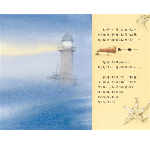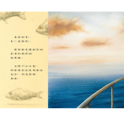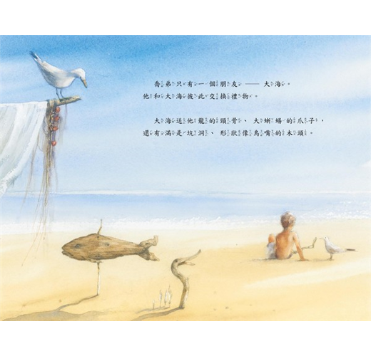 這是關於「捨棄孤單、尋找友誼」的故事。喬弟住在海岸上的燈塔,大海是他唯一的朋友。大海為他帶來龍的頸骨、大蜥蜴的爪子、坑坑洞洞的漂流木,也為他帶來期待已久的消息……。喬弟則送給大海各式各樣的瓶子,瓶子裡都有個紙條,紙上寫的都是同樣的一句話:「大海另一邊有人嗎?」