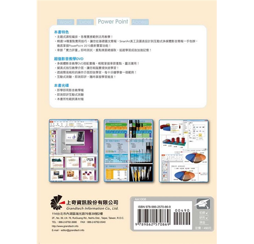 ●精選14種重點實用技巧,讓您從基礎圖文簡報、SmartArt美工及圖表設計到互動式多媒體影音簡報一手包辦,徹底掌握PowerPoint 2010最新豐富功能!
