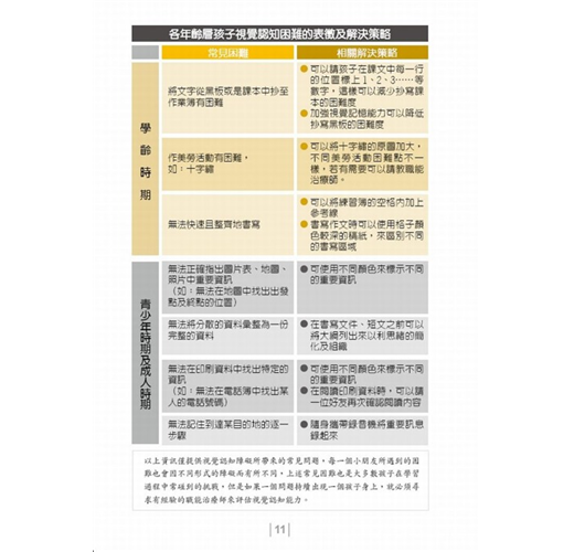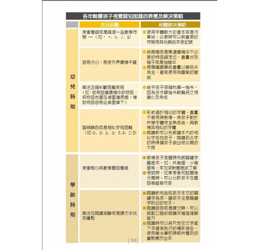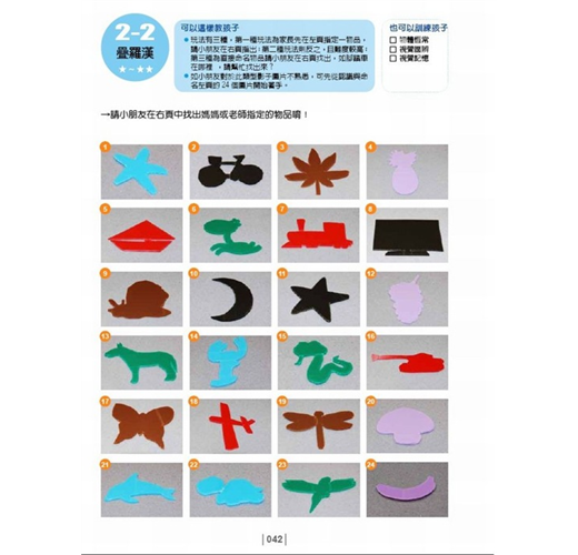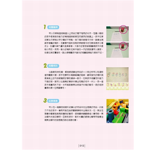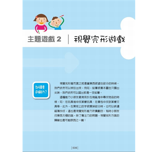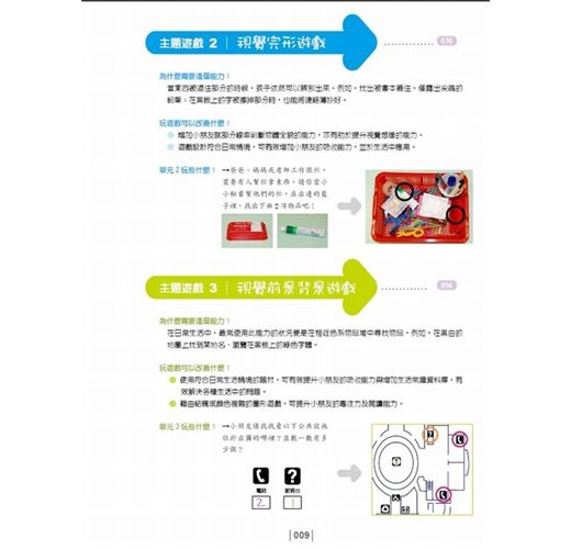 此「遊戲書」共分為七項主題遊戲:視覺區辨、視覺完形、視覺前景背景及視覺記憶遊戲等;並附錄測驗,相當完整。