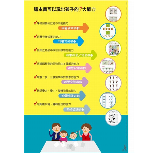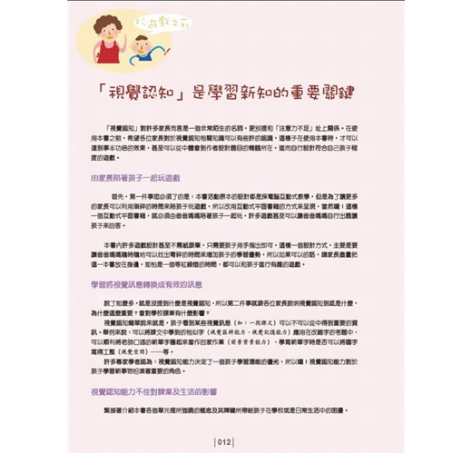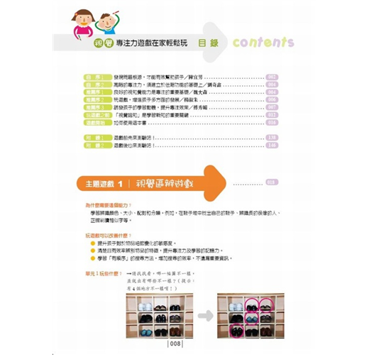 在此書中作者透過七個遊戲單元的設計,包括,視覺區辨、視覺完形、視覺前景背景、視覺記憶、視覺空間、物體恆常、及手眼協調等,主要目的除了藉此增進孩子的專注力、想像力及變通力,亦企圖提升其學習重點線索的記憶力。