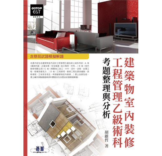 本書內容包含建築物室內裝修工程管理乙級技術士術科考試:A卷(圖說判讀、丈量放樣、安全維護、 施工機具、材料…)B卷(室內裝修相關法規)C卷(相關施工施工、木作、泥作、塗裝、金屬工程、玻璃及壓克力…)D卷(工程管理、裝修工程估算表編製、表格填寫、工地安全衛生、申請建築物室內裝修…)。書上編列測驗題,題庫資料豐富並包含歷屆試題模擬解題。